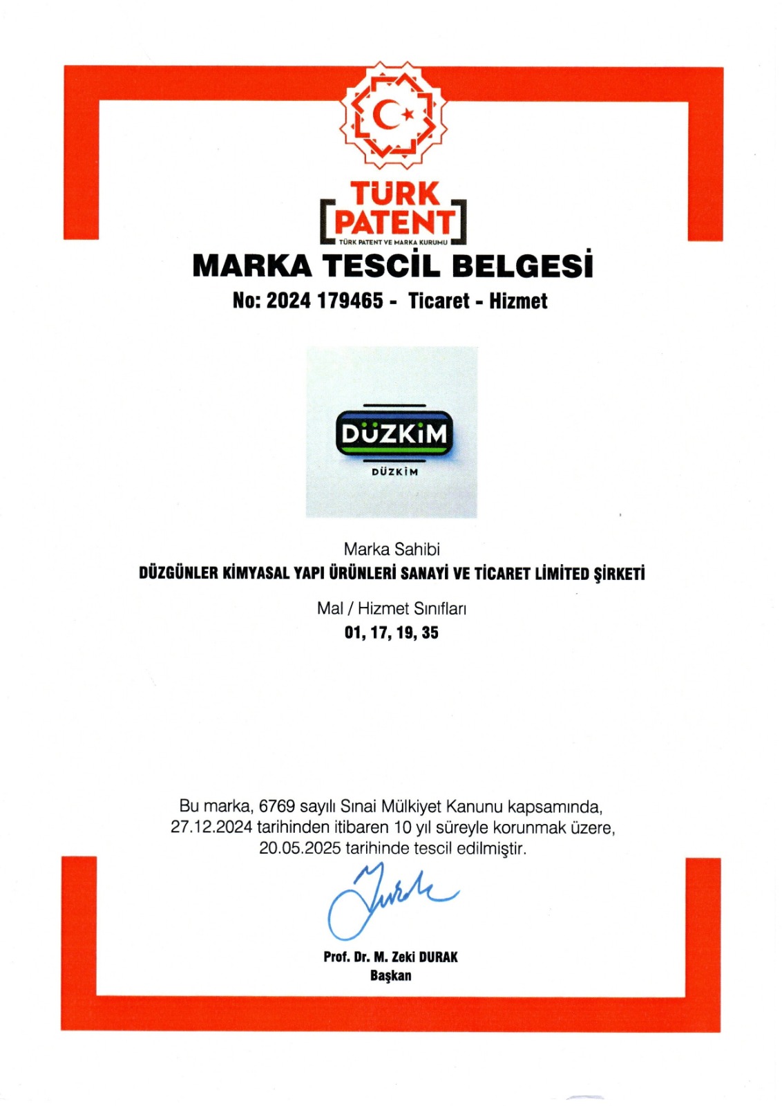DÜZKİM MARKA TESCİL BELGEMİZ